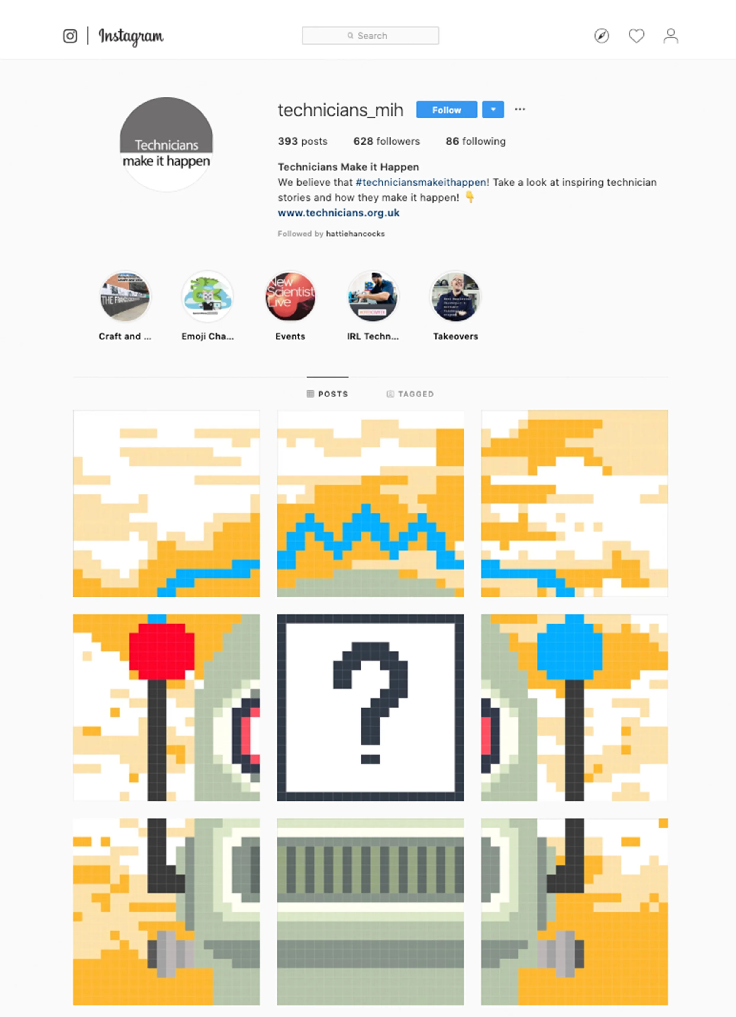 We were challenged with getting those interested in coding more engaged with the technicians programme. We had our users hunt for a piece of a missing robot. We posted a nine tile image that had a missing segment. We led them to our website where they had to search the source code for the robots face.